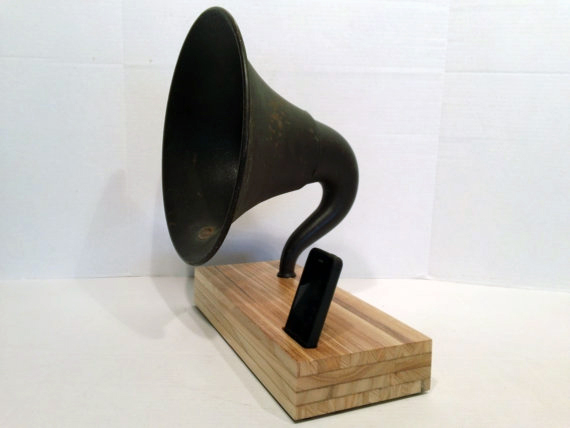 Trust me, when I say this photo (taken from Etsy.com) in no way does justice to ReAcoustic‘s totally acoustic iPhone speaker dock. Your read that right—totally acoustic. These incredible pieces created by Ryan Boase in South Carolina use old instrument or gramophone bells and recycled wood to project sounds from your iPhone (or Droid or iPad) without electrical cords or batteries or small hamsters running on treadmills. Flabbergasted? Click here for a demonstration of how it works.