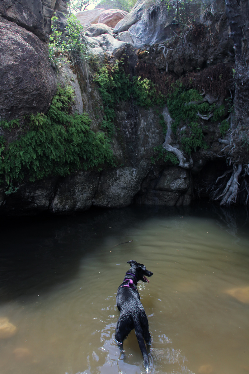 Still, when it comes to large, black dogs, low-90s temperatures in direct sun are like sitting in a tanning bed stuck on high inside a sauna. Samba took to digging up cold dirt under every other desert bush, hunkering down, tongue lolling, as she tried to escape the heat. I thought about turning back, but by now we were closer to the water at the end of the hike than the car with its shade and air conditioning. Apologizing to the dog, we pushed forward.