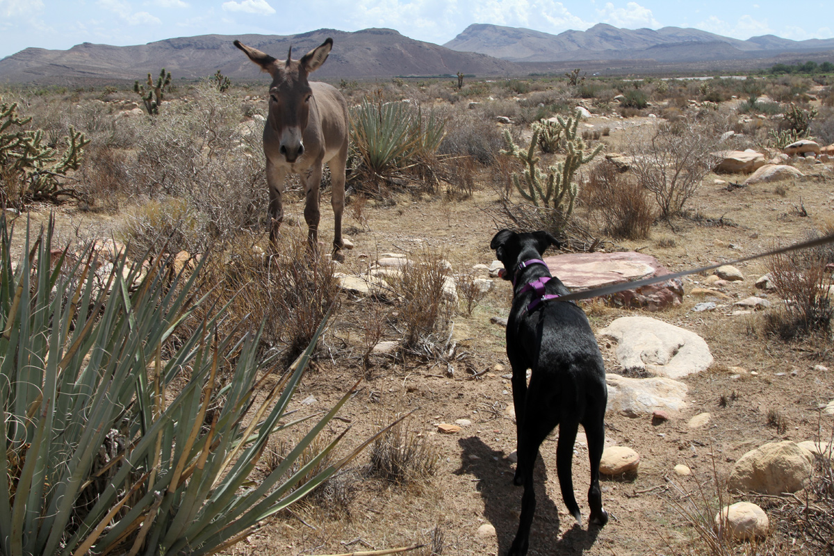 But in the last few weeks the temperature has dropped to reasonable highs in the low 90s. Compared to the searing of mid-July, it’s felt downright pleasant. So, you’ll understand how I could load Samba into the car for a midday desert hike inside the Red Rock Conservation Area to First Creek a few weeks ago. There was a light breeze, a few clouds and a (very) gentle trail that crossed some open desert before descending into a canyon to end at a (very) little pond filled with equally small fish. We even ran into a wild burro that posed for our cameras and engaged Samba in a good staring contest before turning just a bit menacing.